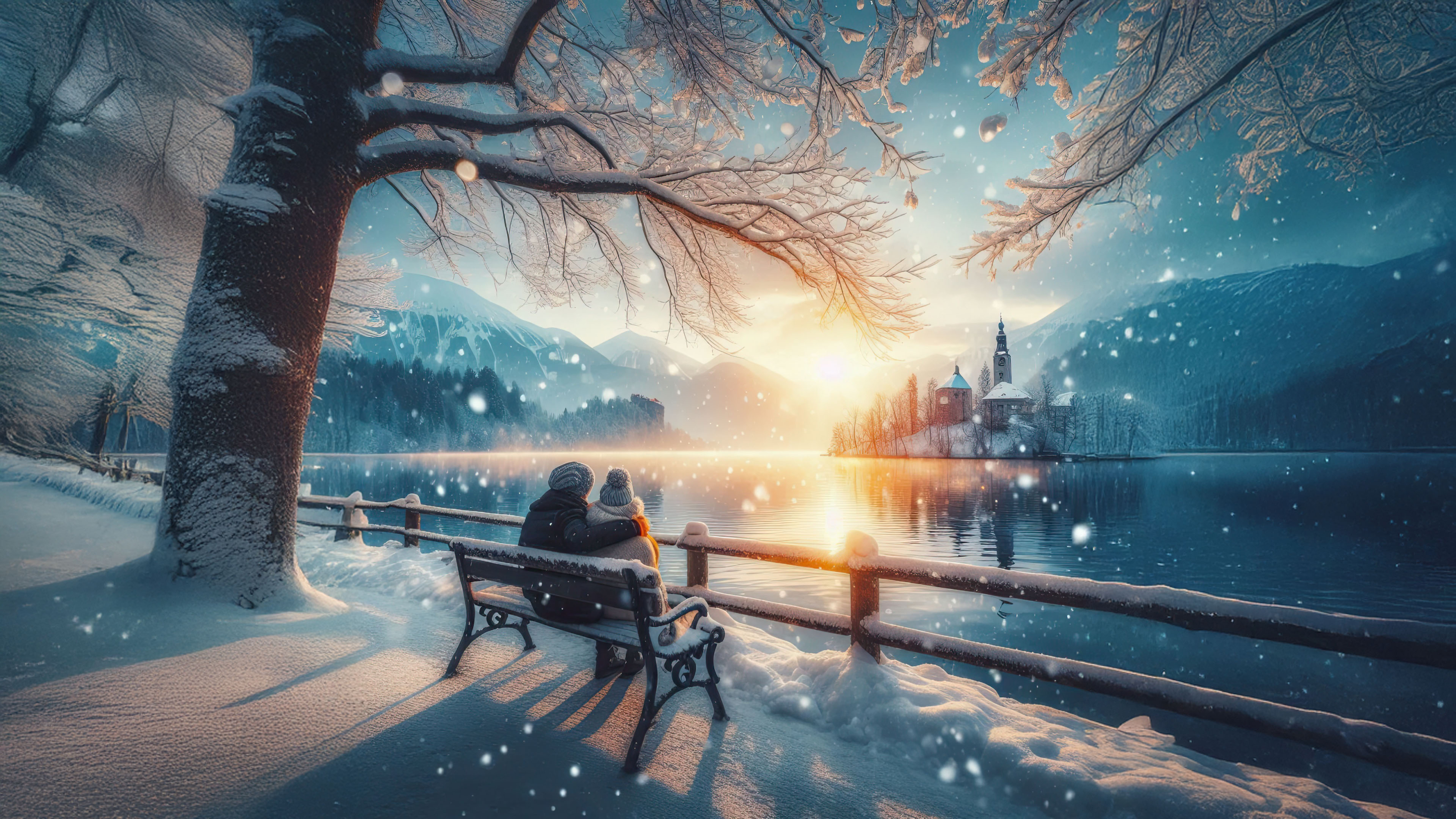 This stunning wallpaper captures a tranquil winter morning with a couple enjoying the beauty of a snowy lake. The serene sunrise casts a warm glow over the mountains and the still waters.