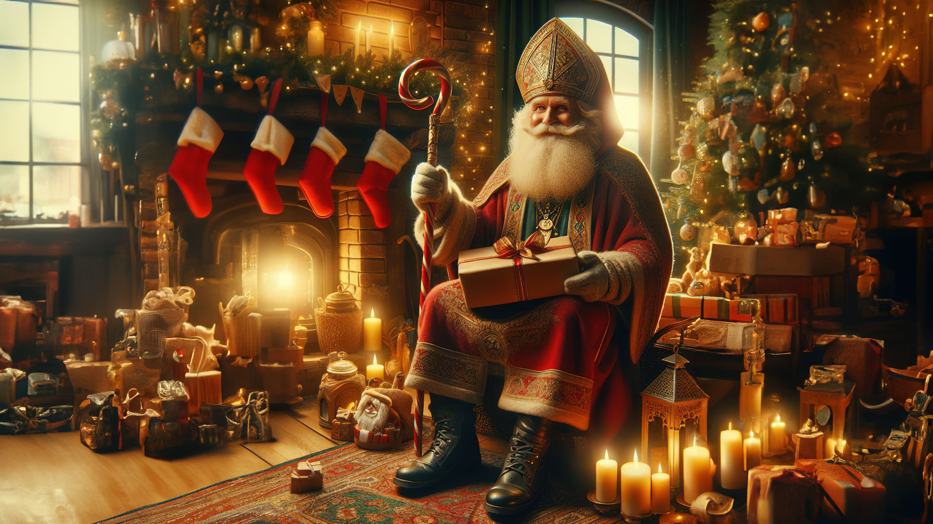 Immerse yourself in the heartwarming scene of Saint Nicholas seated in a festive abode, surrounded by gifts. Explore enchanting images that capture the joyous spirit of giving during the holiday celebration, as Saint Nicholas brings happiness and warmth to the room adorned with festive decorations and presents.
