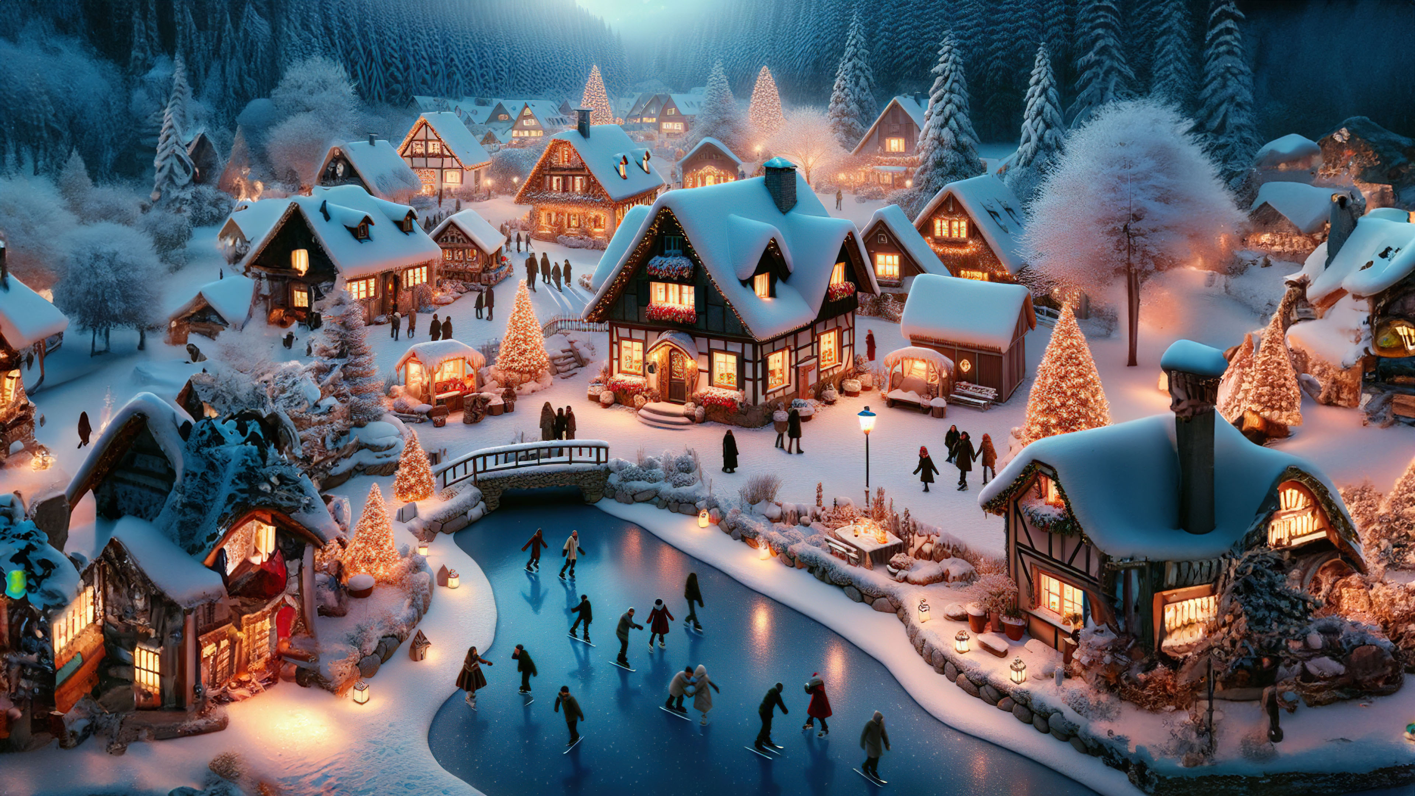 Discover the charm of a small village nestled in the hills, where winter transforms the landscape into a picturesque scene. Snow-covered houses, winding paths, and a frozen pond create a magical setting for the winter festivities.