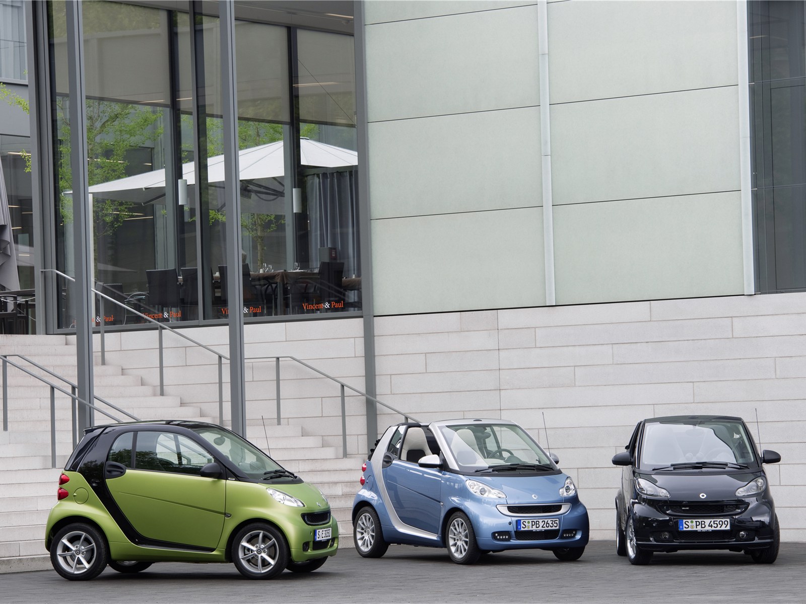 Experience the charm of three Smart Fortwo cars in a row, perfectly aligned for urban efficiency. The lineup showcases the synchronized appeal of these compact vehicles, making a statement in tandem on the road.