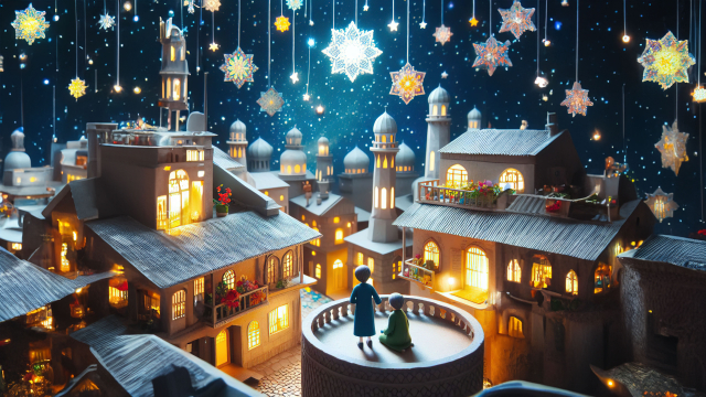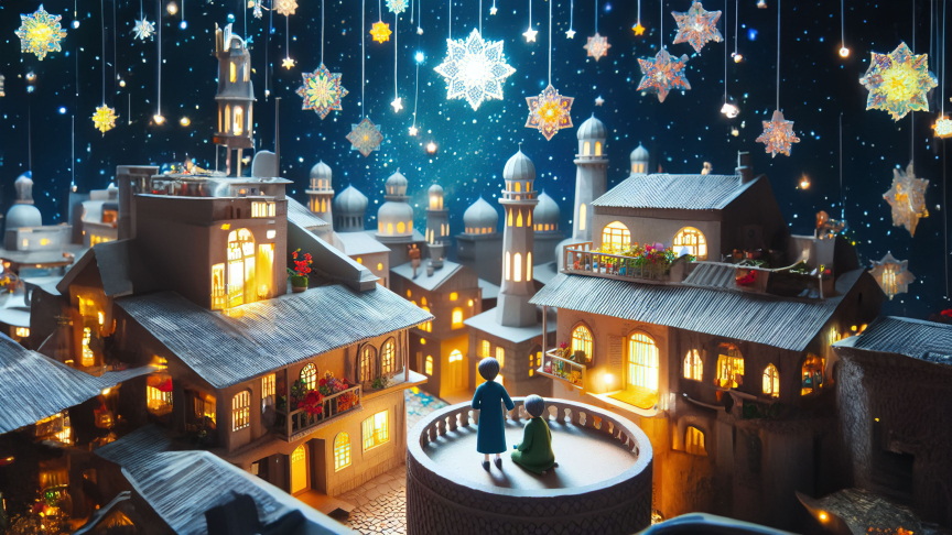 The elevated perspective showcases a charming rooftop view of a village illuminated by lights, surrounded by whimsical stars that bring the night to life.
