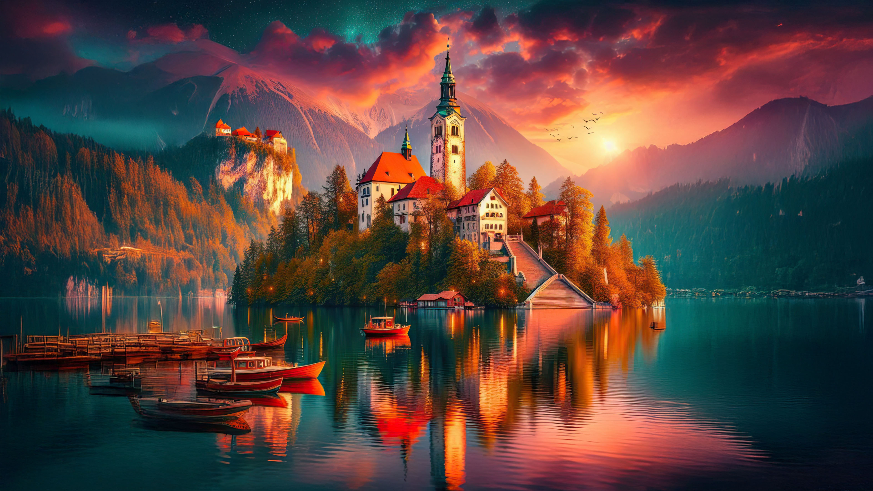 Lake Bled, nestled in the Julian Alps of Slovenia, offers one of the most picturesque landscapes in the world. This iconic image captures the magical charm of its island, church, and castle during a golden sunset, reflecting on its serene waters.