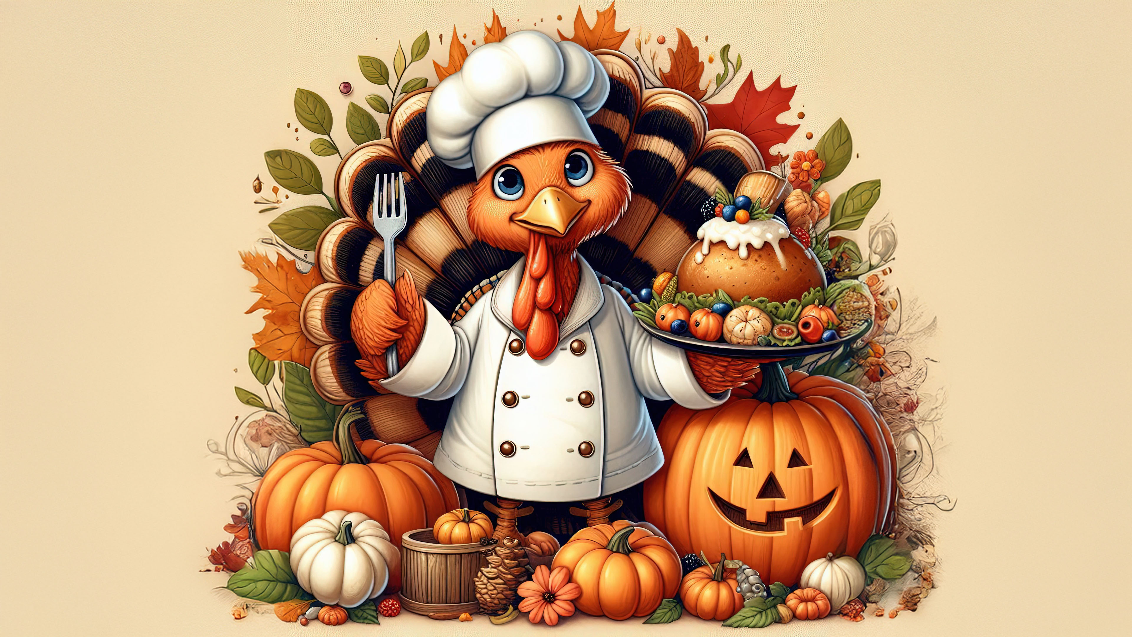 This vibrant wallpaper showcases a cheerful turkey chef dressed in a white chef's coat. The turkey holds a plate filled with Thanksgiving treats, surrounded by pumpkins, colorful autumn leaves, and festive decor. A smiling jack-o'-lantern adds a playful touch to the scene.