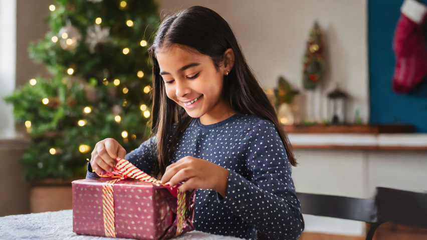 Experience the magic as a girl unwraps her Christmas present, a magical moment celebrating eager anticipation and fluttering excitement, the unveiling of Christmas magic, shared laughter and holiday cheer, wonder and gratitude in small packages, and the overall delightful spirit that makes the act of gift unwrapping a heartwarming and enchanting experience for all.