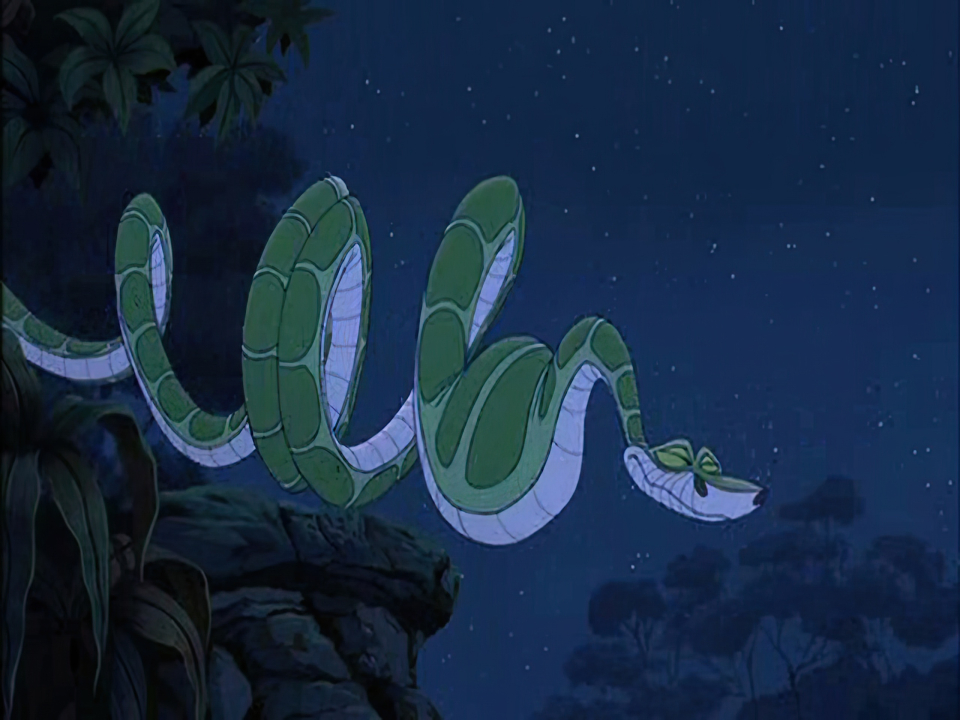 Kaa, the cunning and hypnotic snake from The Jungle Book 2, is captured in this stunning nighttime wallpaper. His slithering form coils elegantly as he watches over the jungle.