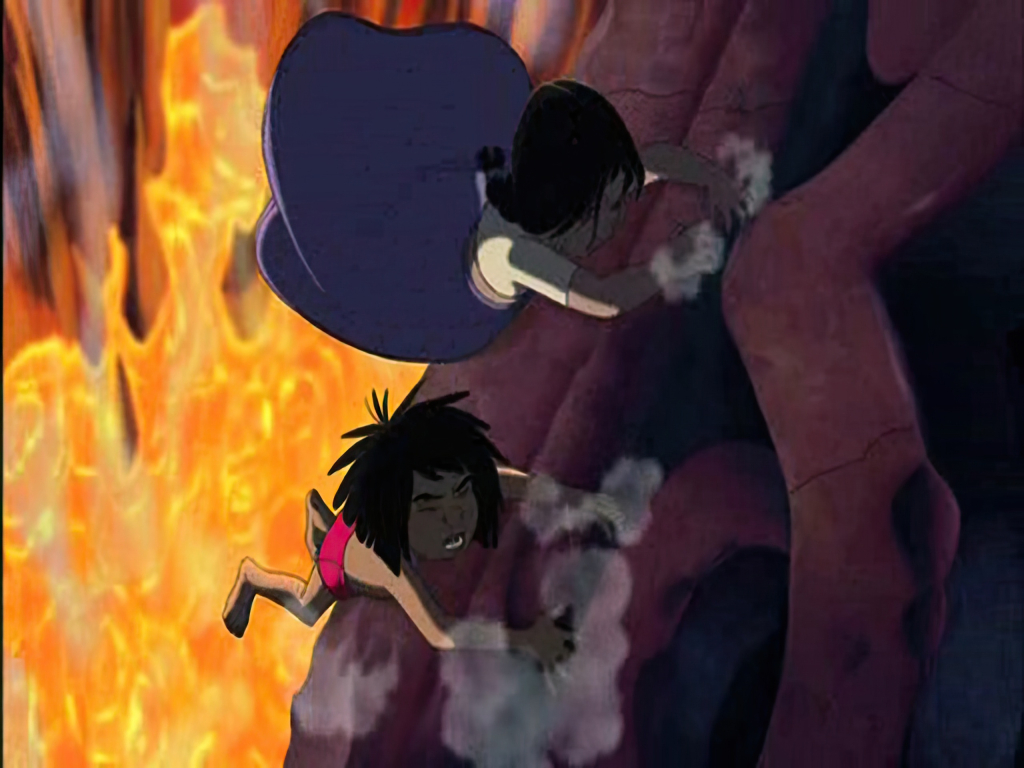 With fire consuming the ruins below, Mowgli and Shanti must rely on their courage and strength to climb to safety. The tension in this scene highlights the adventurous and perilous nature of their journey.