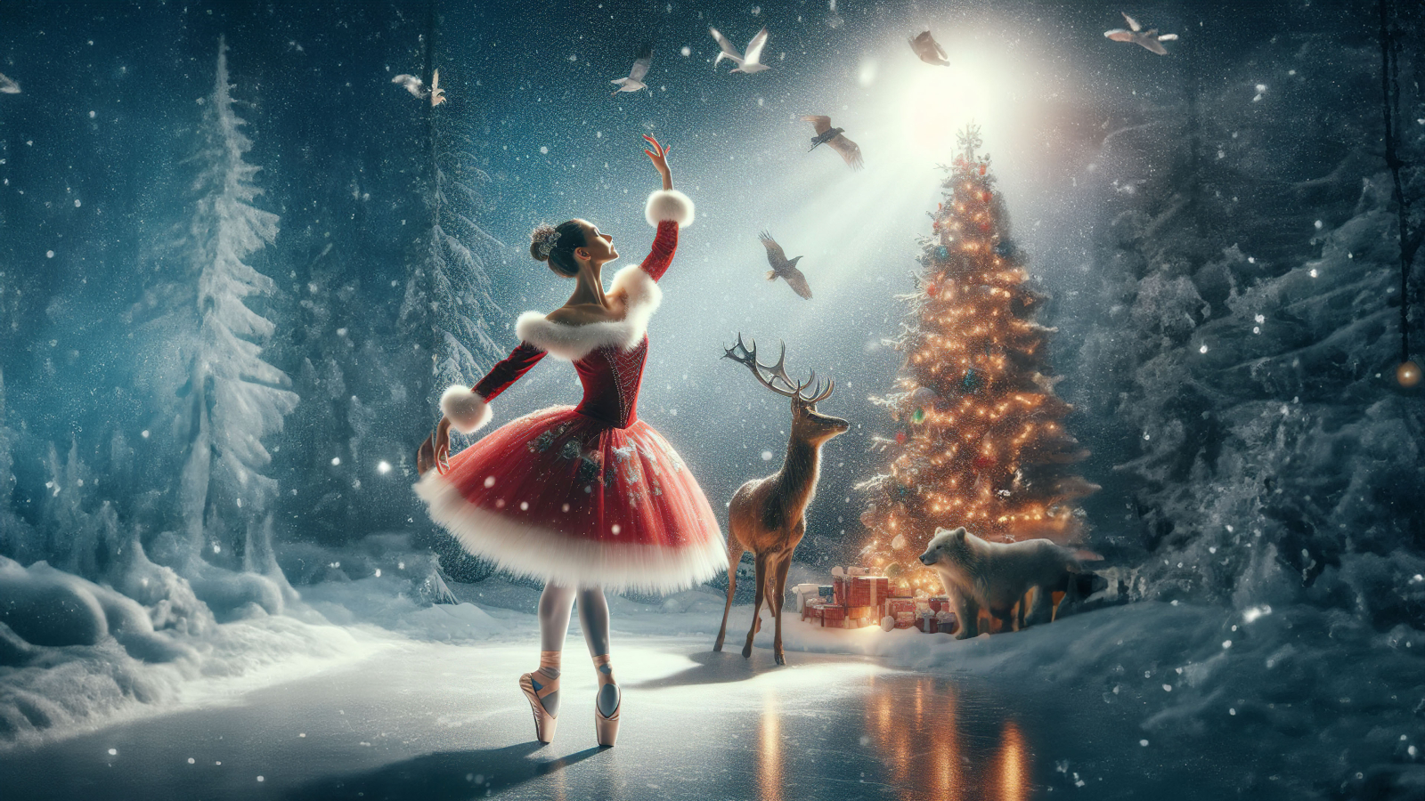 Witness the elegance of dance and the beauty of nature in a winter wonderland as you experience the enchantment of winter ballet with a ballerina and a deer. Under the Christmas night sky, the ballerina's dance captivates, and the deer watches with gentle curiosity.