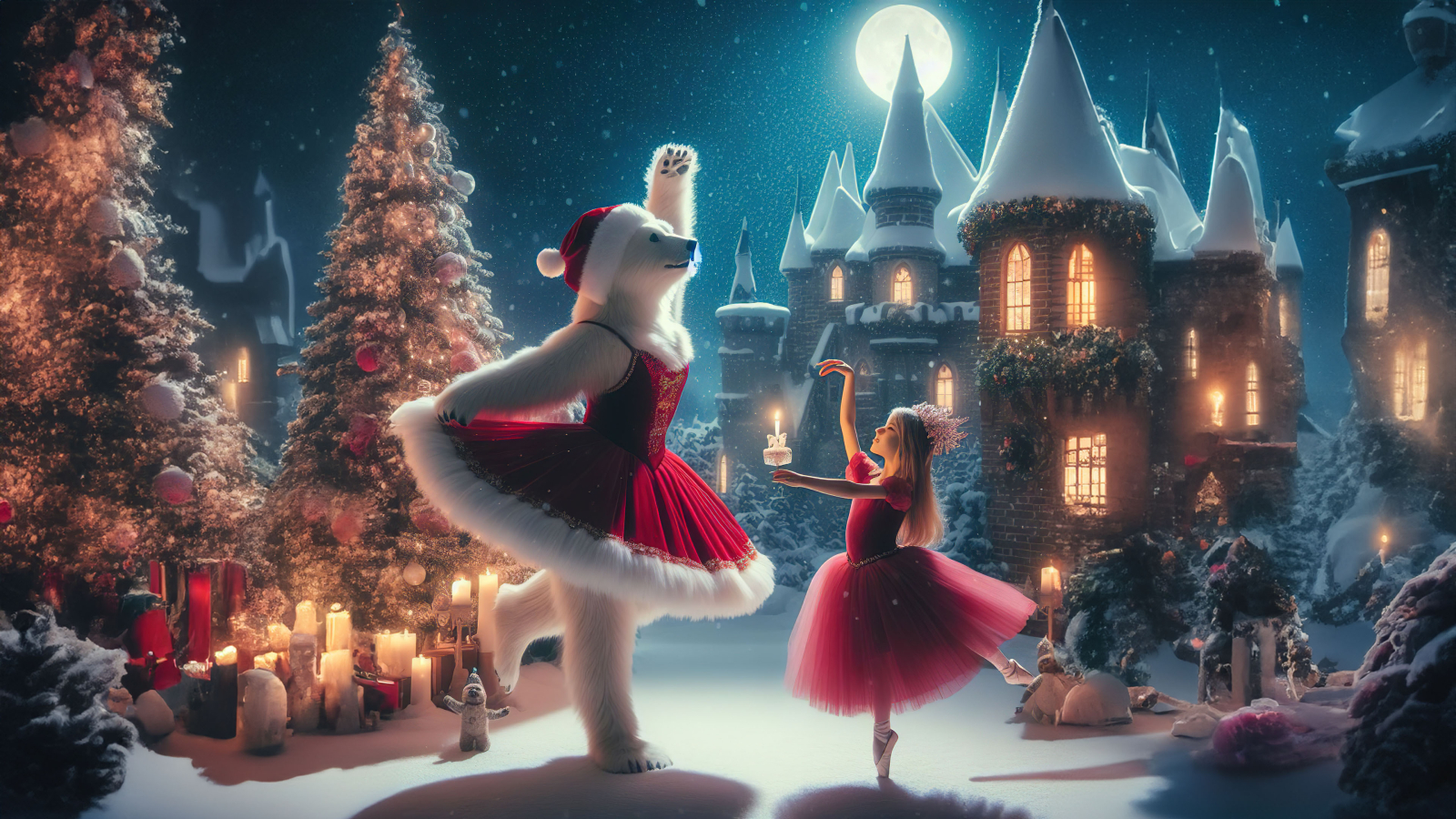 Witness the beauty and grace of a ballet performance in the heart of winter. The little girl and white bear dance with elegance and charm, creating a whimsical scene that captures the joy of the season.