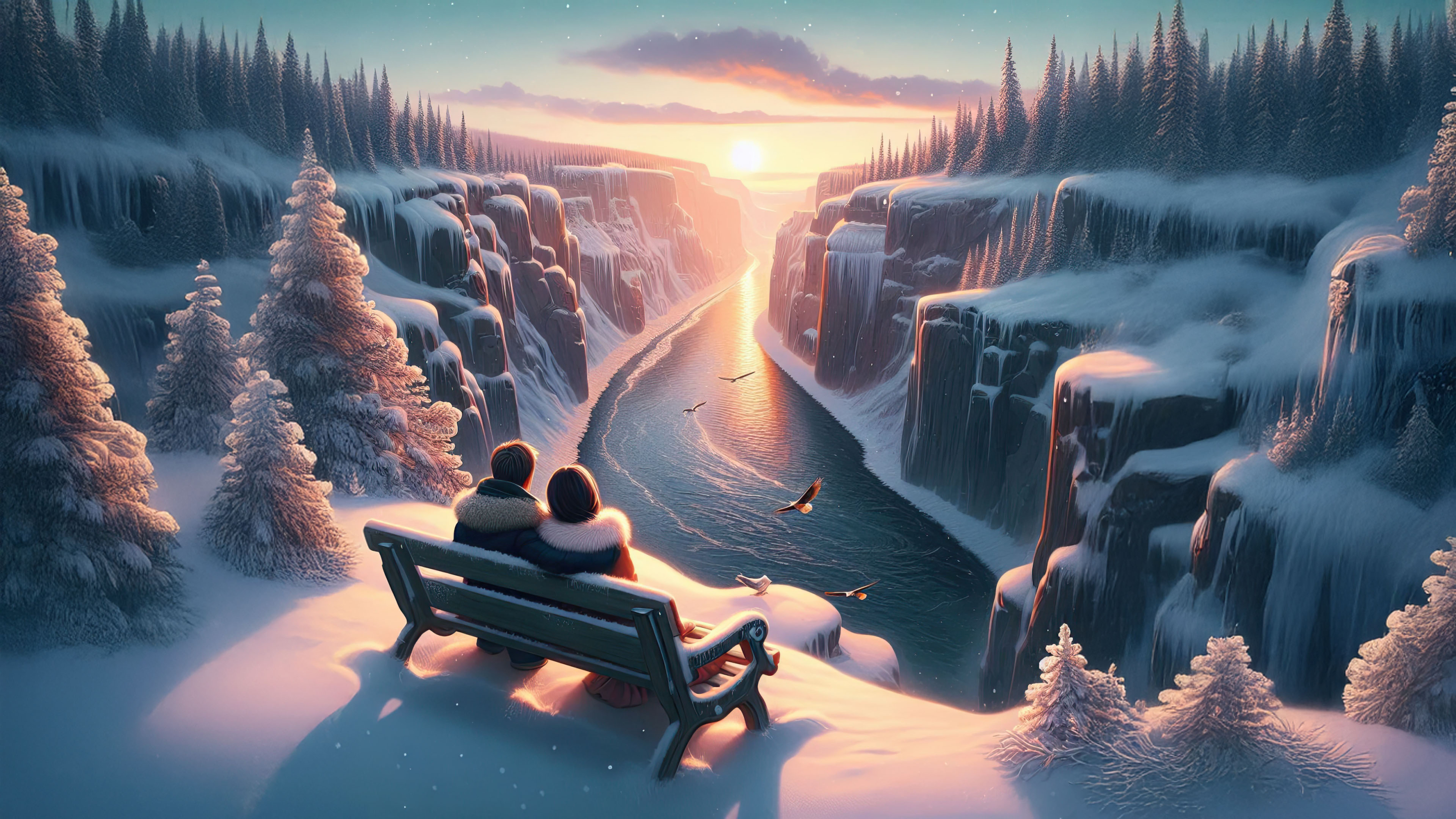 This wallpaper invites you into a serene winter wonderland where a couple sits on a snow-dusted bench, gazing at the golden hues of a sunset reflected on a frozen river. Towering canyon walls covered in delicate frost complete this picturesque scene, evoking a sense of peace and connection.