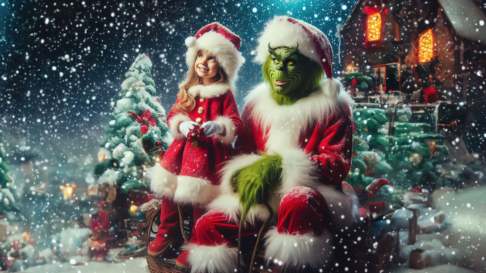 Delve into the enchanting snowy delight that surrounds the Grinch and the little girl as they share this delightful moment. Explore the soft snowfall, the wintry atmosphere, and the overall festive charm that enhances the magic of their winter encounter.