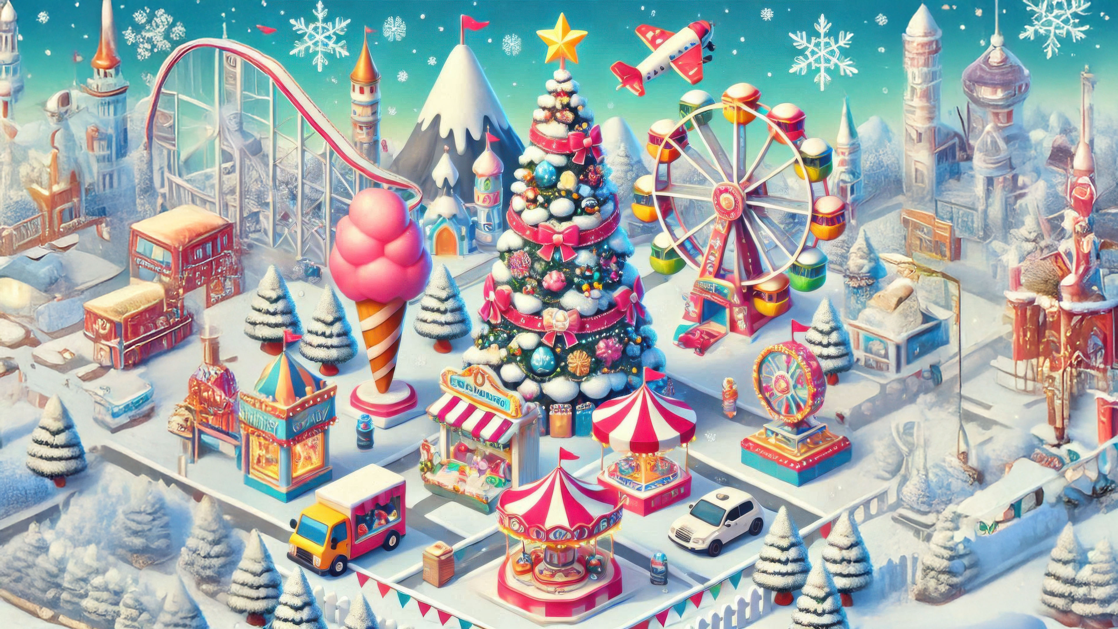 This winter amusement park scene perfectly captures the excitement and magic of the season, making it a perfect representation of holiday cheer, family fun, and the spirit of Christmas.