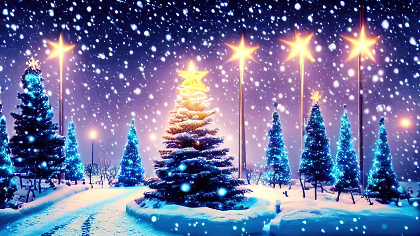 Delve into the twinkling lights in the evening glow, turning the outdoor scene into a magical spectacle. Explore the colorful bulbs, the shimmering ornaments, and the overall festive ambiance that transforms the surroundings into a joyous and visually stunning display during the holiday season.