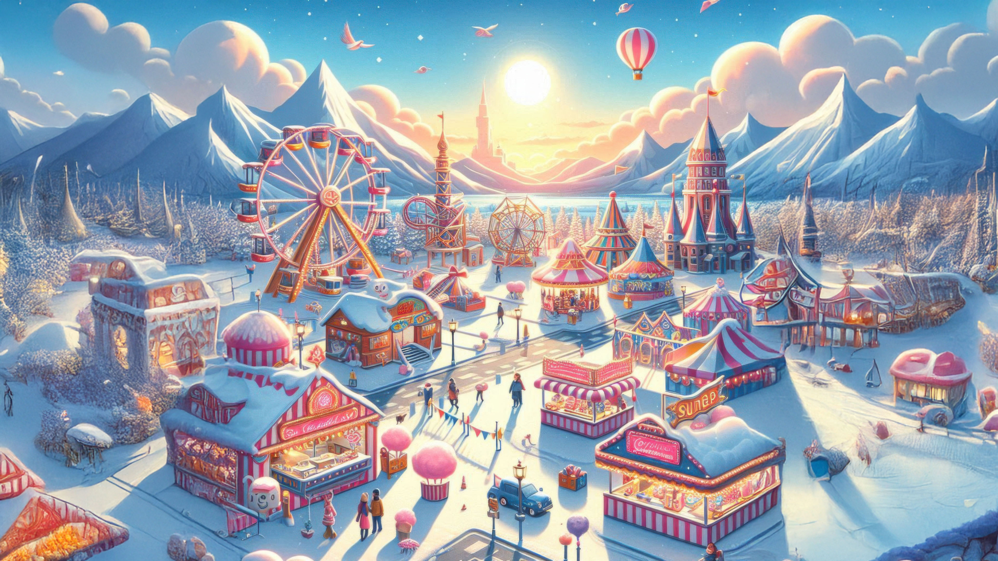 The glowing winter sun illuminates the snowy mountains and fairground, creating a magical atmosphere. Hot air balloons drift in the sky, while colorful banners and lights add to the festive spirit of this picturesque winter wonderland.