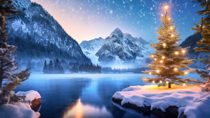 Experience the tranquil majesty of a winter Christmas scene, embracing nature's beauty with snowy mountains, a lakeside tranquility, and a majestic Christmas tree adorned with warm white lights. Immerse yourself in the serene ambiance, festive charm, and overall delightful spirit captured in this exclusive article, celebrating the magic of winter in the heart of Christmas.