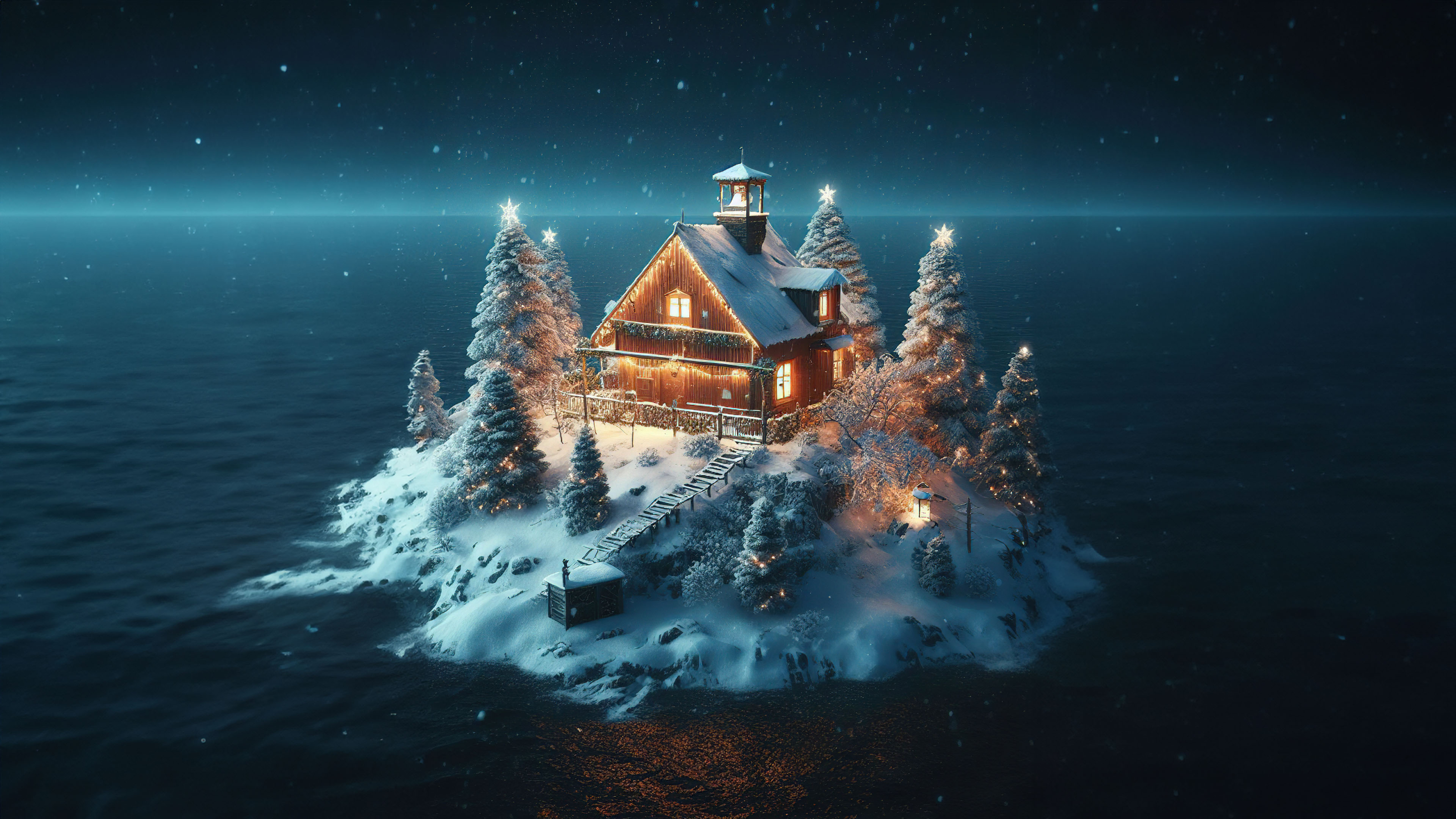 Magical Christmas Night: Wooden House on a Snowy Island
