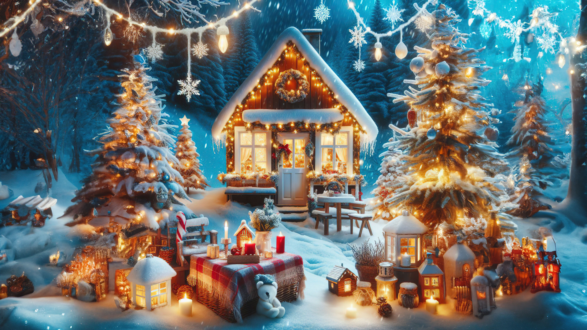Discover the harmonious blend of nature and holiday magic in this picturesque scene. This article celebrates the synergy between the natural beauty of the forest and the festive cheer brought by the wooden house, Christmas trees, and decorations.